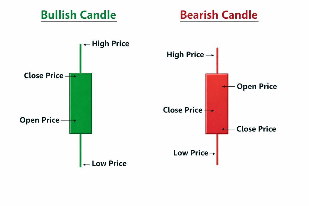 - Bearish candle (usually red): Price closed lower than it opened
